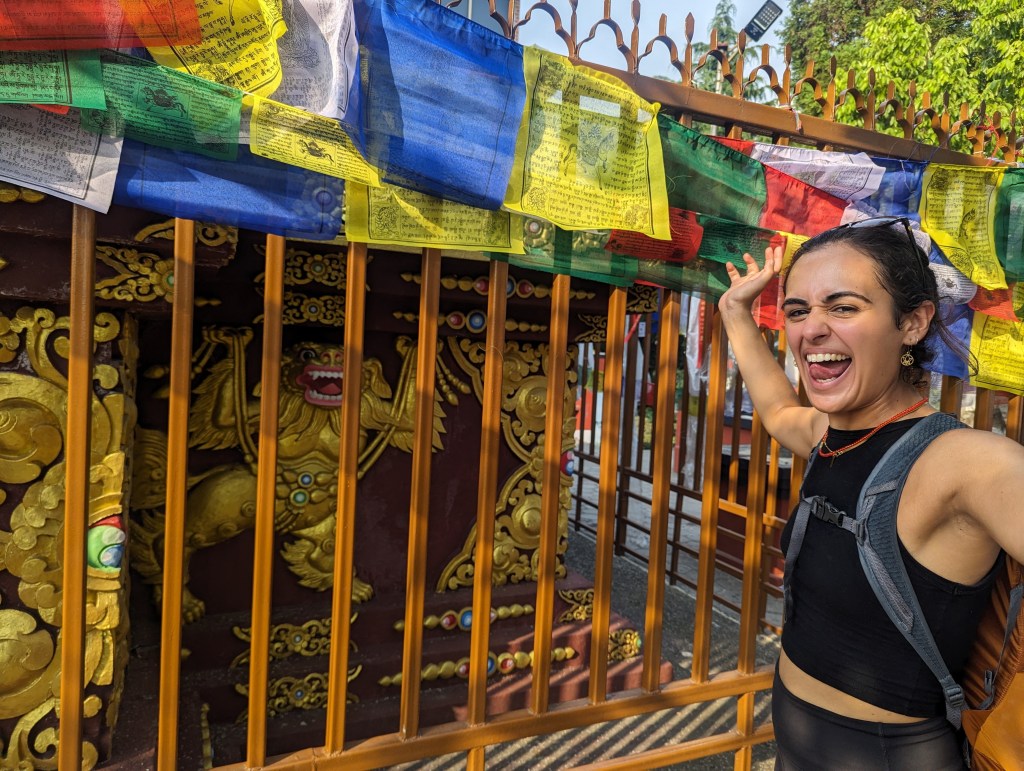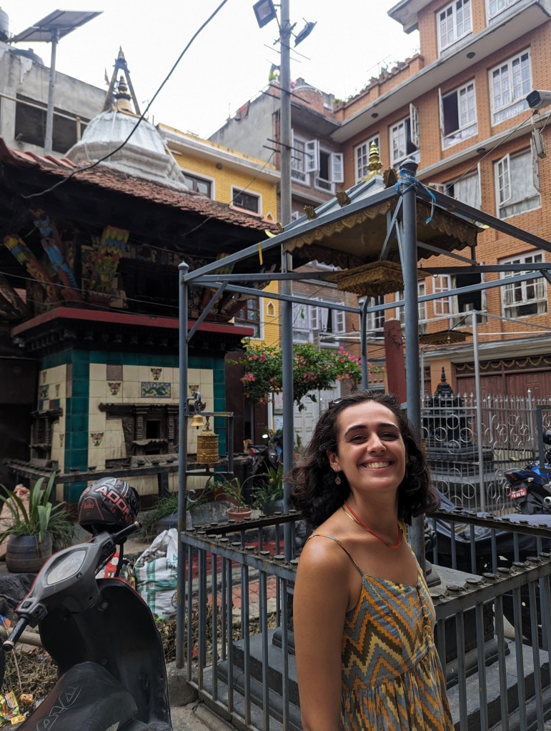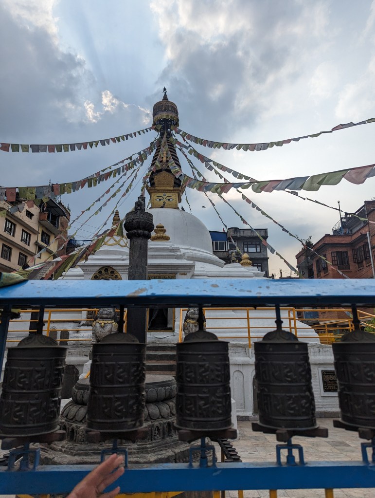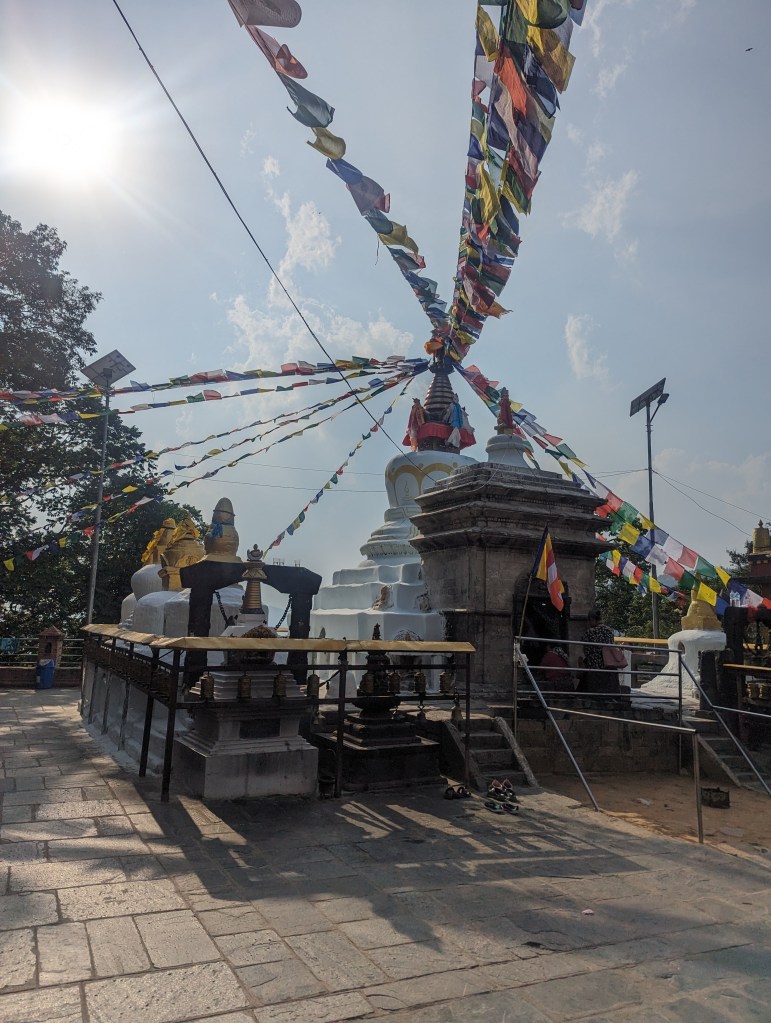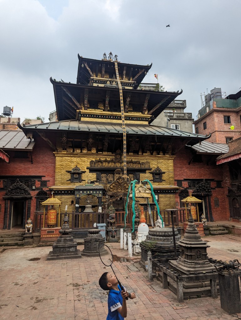 Once back in Patan we, and half of Ellie’s eyebrows, rejoined the walking route, which took us past one or two more temples. One of these was a Buddhist temple and courtyard with Buddhist statues and monuments. We stepped inside, and were greeted instantly by a number of small children who insisted we come to see the Patan Kumari. We did a quick tour of the statues and made our exit, not wanting too much more hassle. After looking it up, Kumaris are a relatively common practice in the Kathmandu valley, where a young girl of about five is selected to be the embodiment of the divine feminine energy, Durga or Shakti, and seems to have to sit all day and receive audiences of people hoping for blessings or their fortunes told by how she acts in their presence. This carried on day in day out until she started her period, then a new Kumari was found. This wasn’t something we really wanted to see, so we made off back towards the hotel.