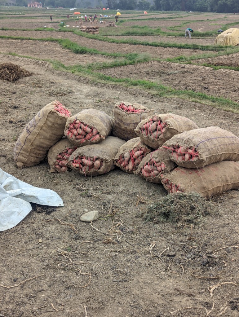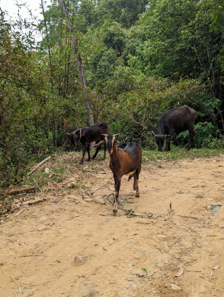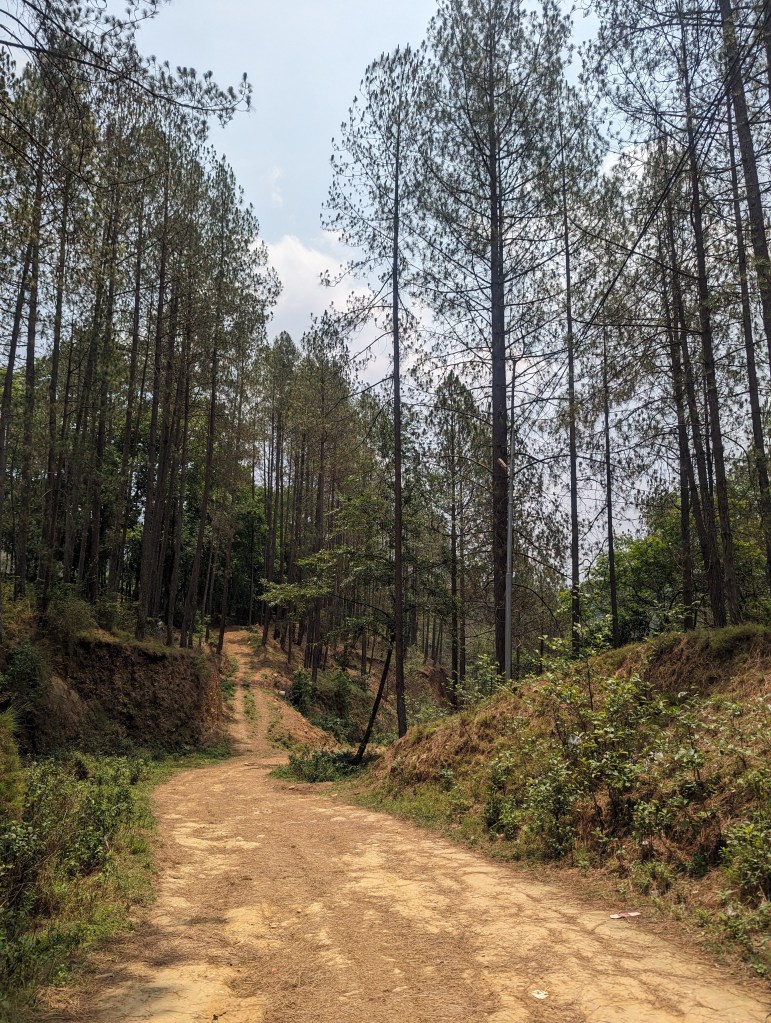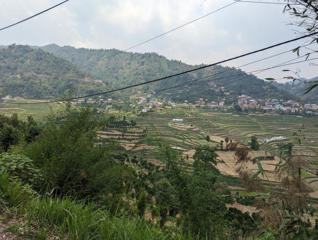 The Nepali thali was delicious and worth waiting for, given our only other option would have been a bag of crisps and some biscuits from the local shop. Once fed, we found (with the help of some Nepali village elders that thought my confusion was hilarious) a different path down from the hill back into Balthali, and back onto the route north-east. We passed out of Balthali and across a field in which the whole village seemed to be working – hoeing, picking potatoes, carrying bags, planting – and through a small forest.