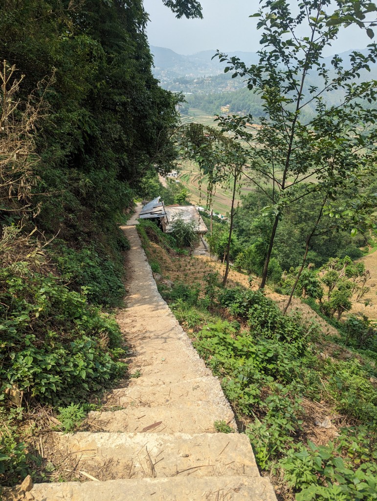 The path then took us down through the woods and to another cable footbridge over a river, then climbed steeply back up a access track to the hilltops. Here, we passed through a number of rural villages which, in some places, looked remarkably French. The locals largely left us alone, to the extent that Ellie was roundly ignored by a group of Nepali women when she approached what looked to be an outdoor shop to buy water, but which turned out in all likelihood to just be their open air kitchen.