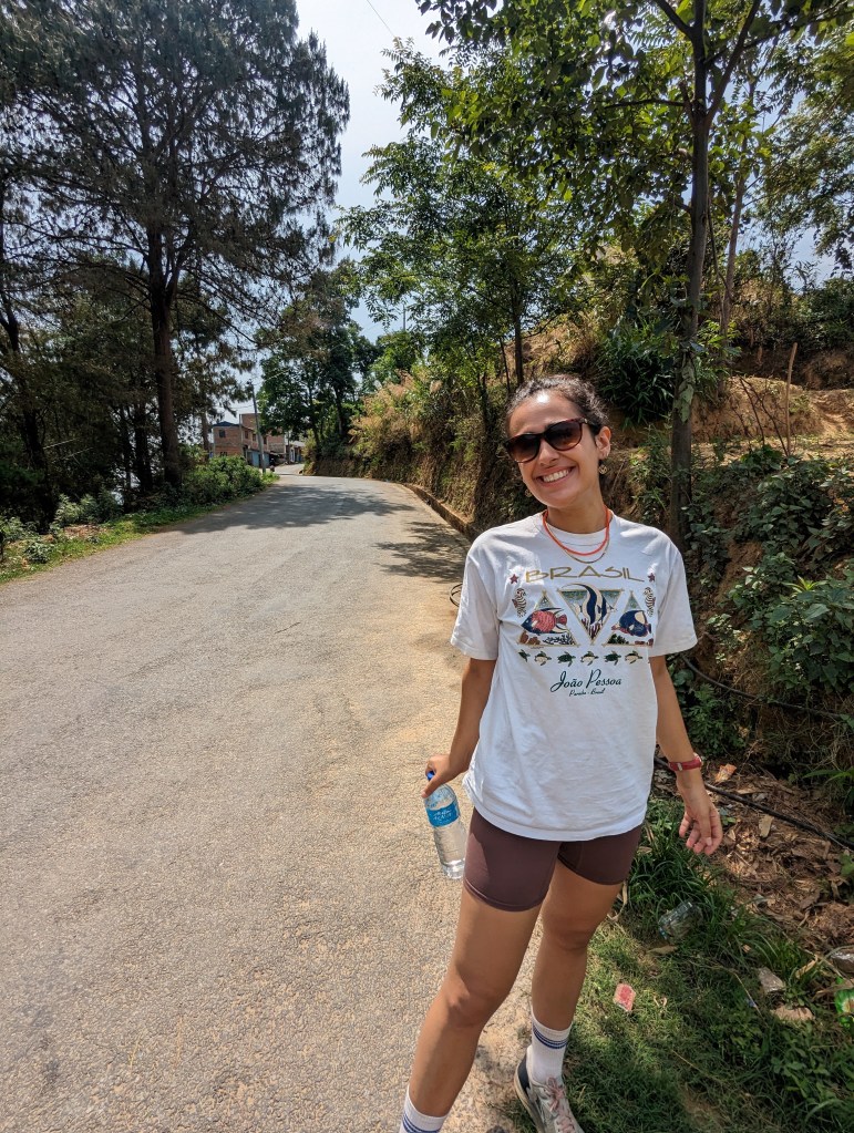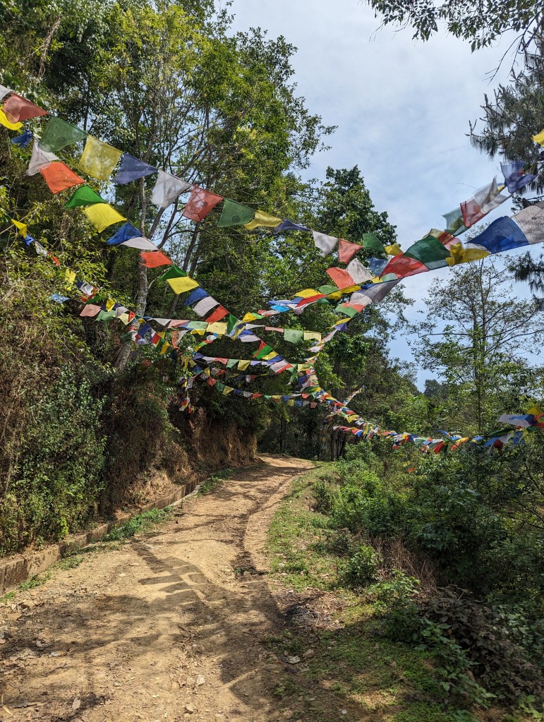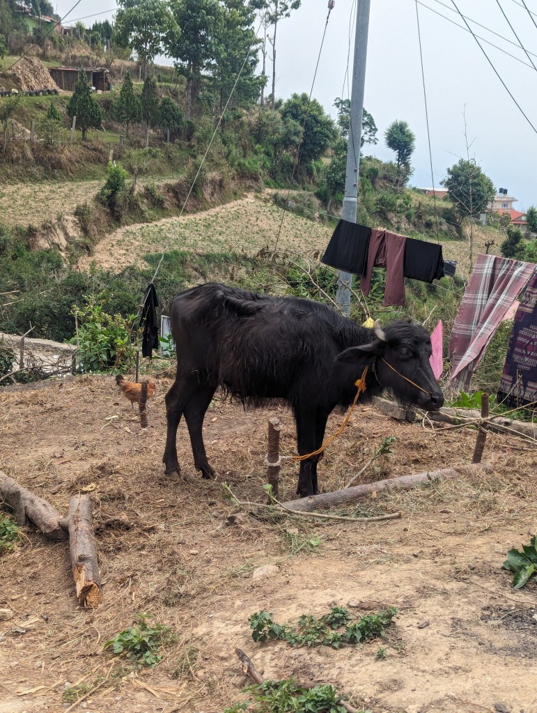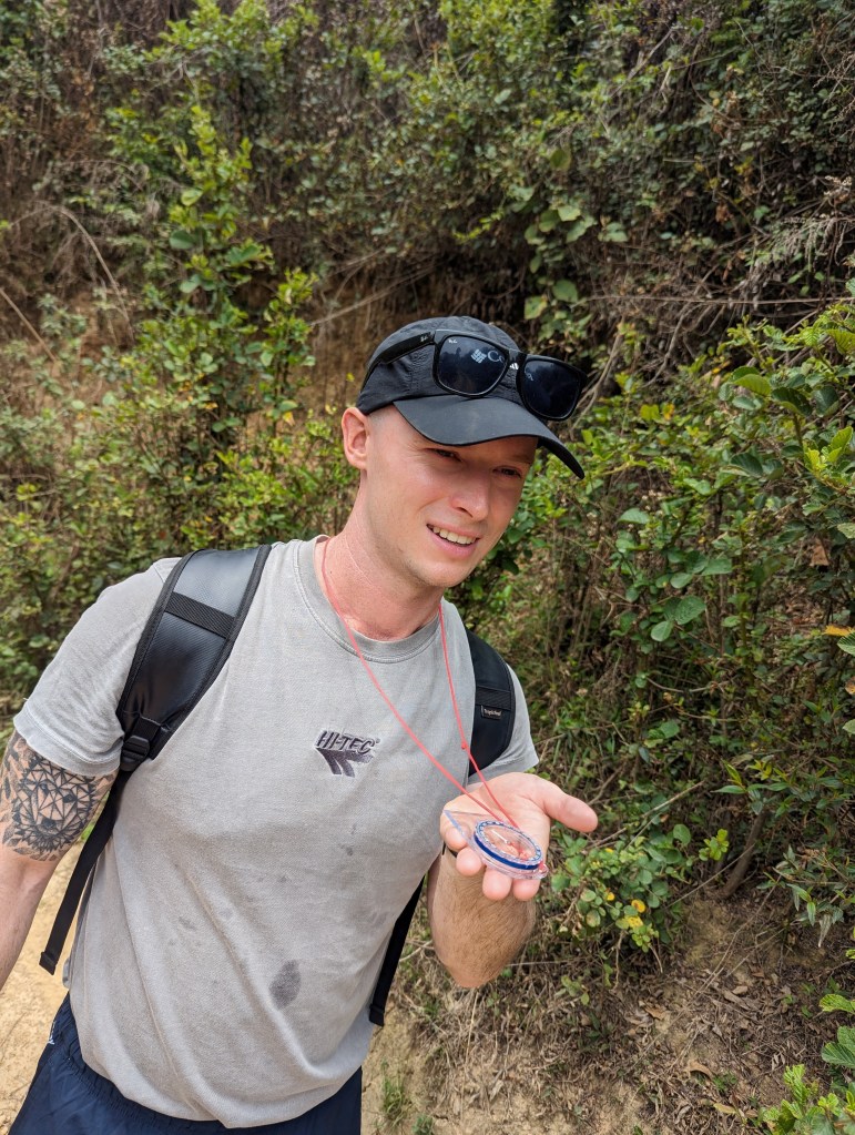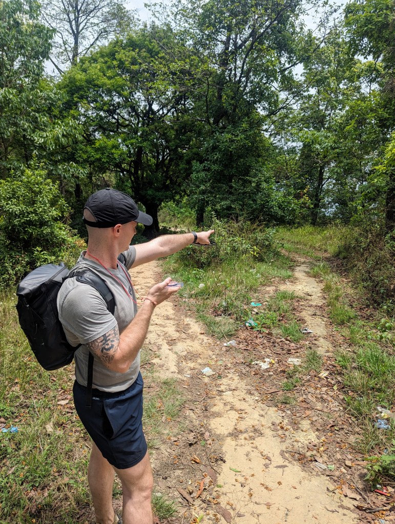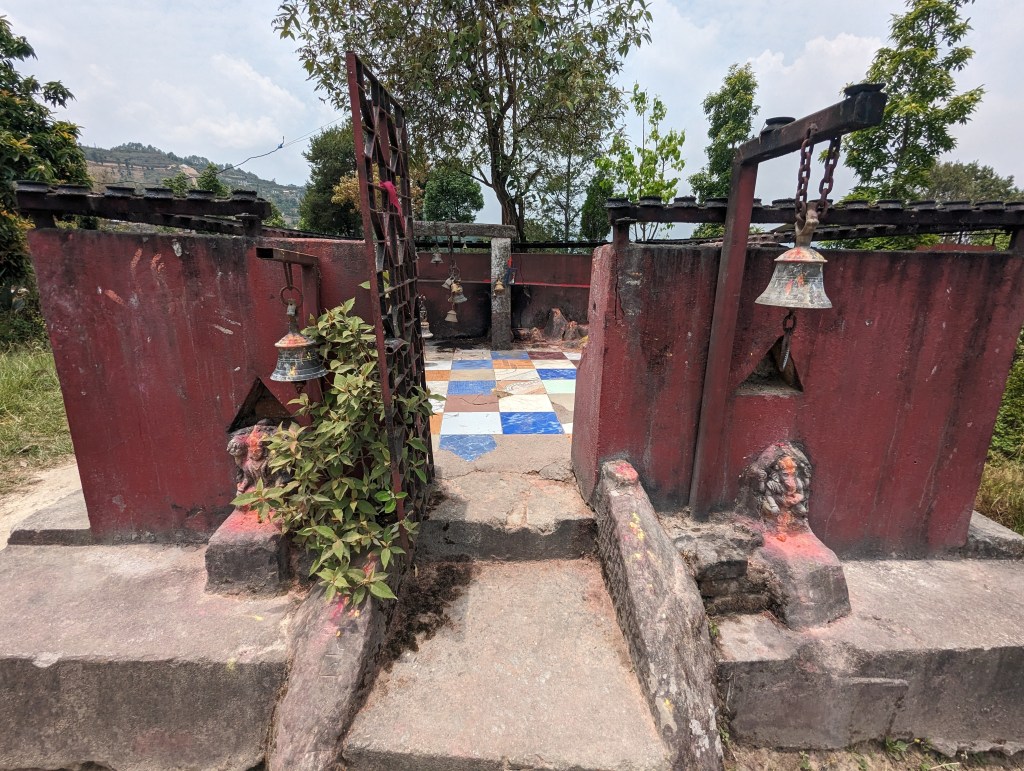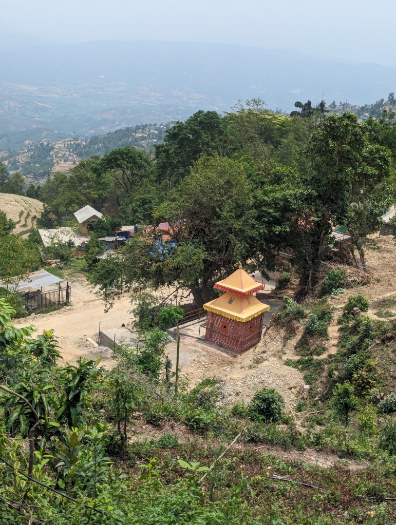 We set out back into the village and towards the monastery, then swung north to walk to the larger town of Dhulikhel by the circuitous, scenic route. This took us up over a crest of the hill and gave glorious views of the valley and the back of Namobuddha monastery on the adjacent hill. We walked for some time, passing through more rural villages with their attendant Buddhist and HIndu shrines. (Eagle-eyed observers may note my compass which was not strictly required but Kieran, a dear friend, had bought it for me so needed to make sure I had evidence of its use).