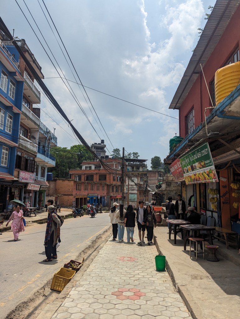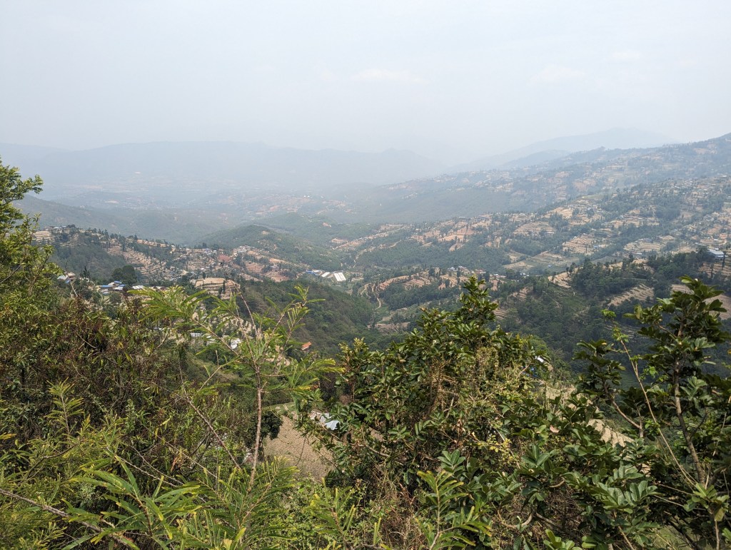The walk to Dhulikhel from Namobuddha was all of about three hours, and the last hour took us slowly up a road carved into the side of a particularly large foothill, then turned sharply around and led down the other side to Dhulikhel itself. The first stretch boasted wonderful views into the valleys, all of which were terraced with tiny plots of land and dotted with settlements. Along this second stretch were innumerable hotels all called things like “Hotel Good View”, “Hotel Snow View”, or “Hotel Vista”. There seemed to be no tourists in sight (though granted we were now in the shoulder seasons), and the whole place had the feeling of the bust after a boom.