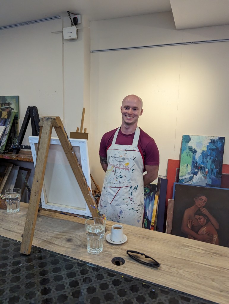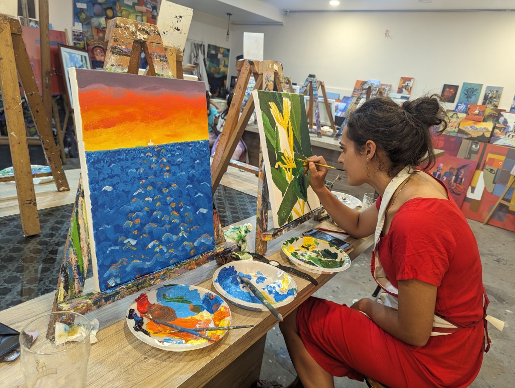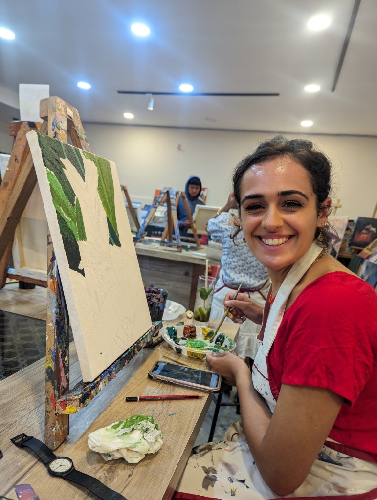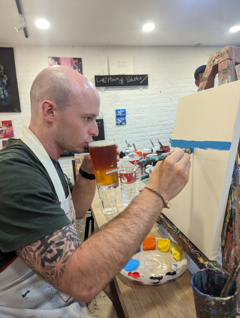 I (Ellie) spent far too long sketching my idea from a photo we took in a botanical garden in Kolkata and frankly could have put hours away before touching paintbrush to canvas if I hadn’t had the confidence boost of a couple of mojitos. Before long though we’d both covered our canvases and large parts of our hands in shades of green, yellow, red and blue and the time flew. It was pretty mindful and engrossing and we were both saying we should get some cheap acrylics and do this at home! A big mix of people seem to use the studio – from some really really good artists around our age or older to some rowdy children whose parents clearly wanted an hour’s respite. The peace was intermittently disturbed by one particular child across from Rob who wrecked absolute havoc on the place whenever an eye was turned (bless her), getting her hands into every paint pot. At one point she was about to push her painting over into Rob’s pint when he tried to stabilise it and in doing so managed to tip her freshly painted canvas down onto her little head. Luckily, both her and her supervisors seemed unbothered and she was already so covered in paint it didn’t matter much.