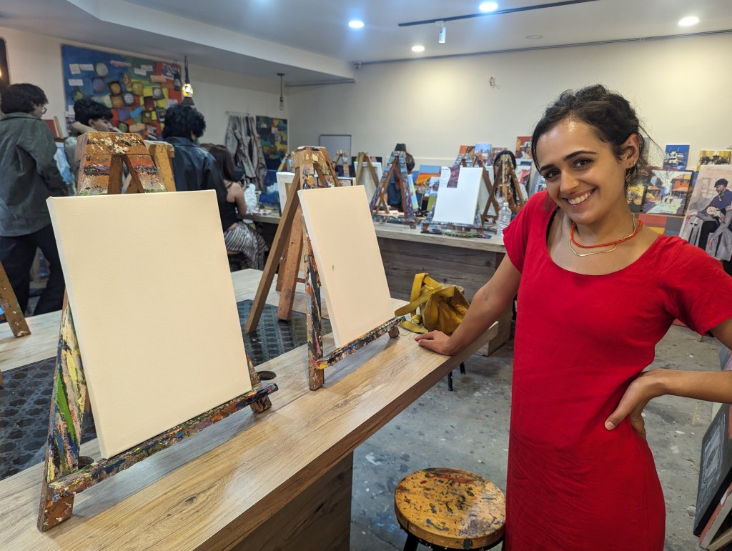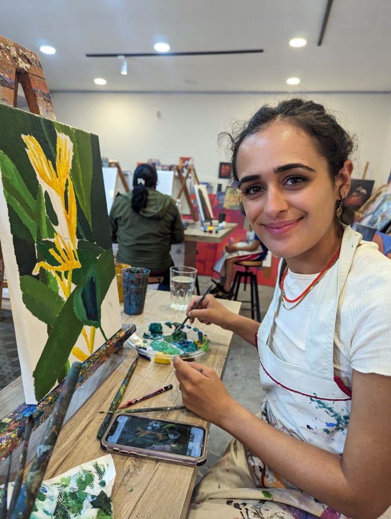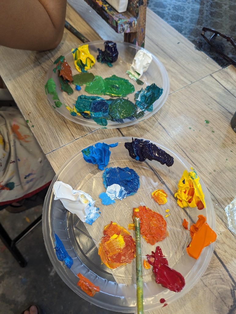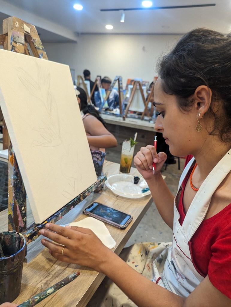 I (Ellie) spent far too long sketching my idea from a photo we took in a botanical garden in Kolkata and frankly could have put hours away before touching paintbrush to canvas if I hadn’t had the confidence boost of a couple of mojitos. Before long though we’d both covered our canvases and large parts of our hands in shades of green, yellow, red and blue and the time flew. It was pretty mindful and engrossing and we were both saying we should get some cheap acrylics and do this at home! A big mix of people seem to use the studio – from some really really good artists around our age or older to some rowdy children whose parents clearly wanted an hour’s respite. The peace was intermittently disturbed by one particular child across from Rob who wrecked absolute havoc on the place whenever an eye was turned (bless her), getting her hands into every paint pot. At one point she was about to push her painting over into Rob’s pint when he tried to stabilise it and in doing so managed to tip her freshly painted canvas down onto her little head. Luckily, both her and her supervisors seemed unbothered and she was already so covered in paint it didn’t matter much.