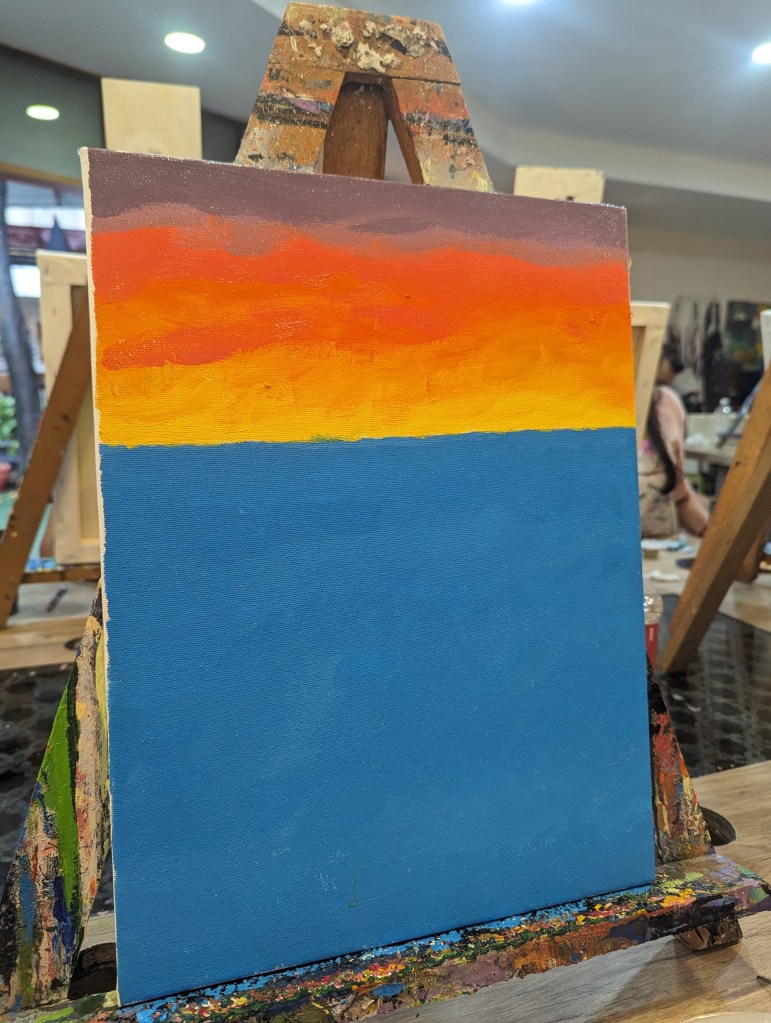 The place was called House of Palettes, and was essentially an art studio where you paid for a blank canvas, and could freely use the acrylics and brushes for however long you pleased over however many days you pleased. It was on the same complex as a modern bar/restaurant from which you could order drinks or snacks to have while you painted. It was staffed by a group of young artists who in theory could advise/help you, but they had their hands full practically doing the paintings for young children and anyway neither of us are exactly aspiring for perfection. We ordered a pint and a cocktail and settled in with our ideas.