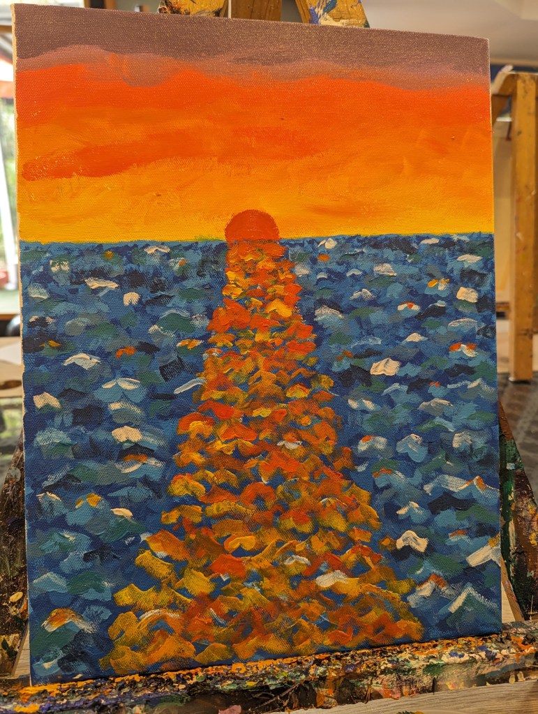 By noon, we were getting hungry and so we walked the half an hour or so back towards the House of Palettes painting studio and its adjacent cafe. After having lunch in the cafe, we set ourselves back up in the studio to finish our masterpieces. Mine was pretty much ready to go, so I spent a hour or so adding some more colour to the sea and repainting the little yacht on the horizon, while Ellie had several large, blank patches of canvas to fill.