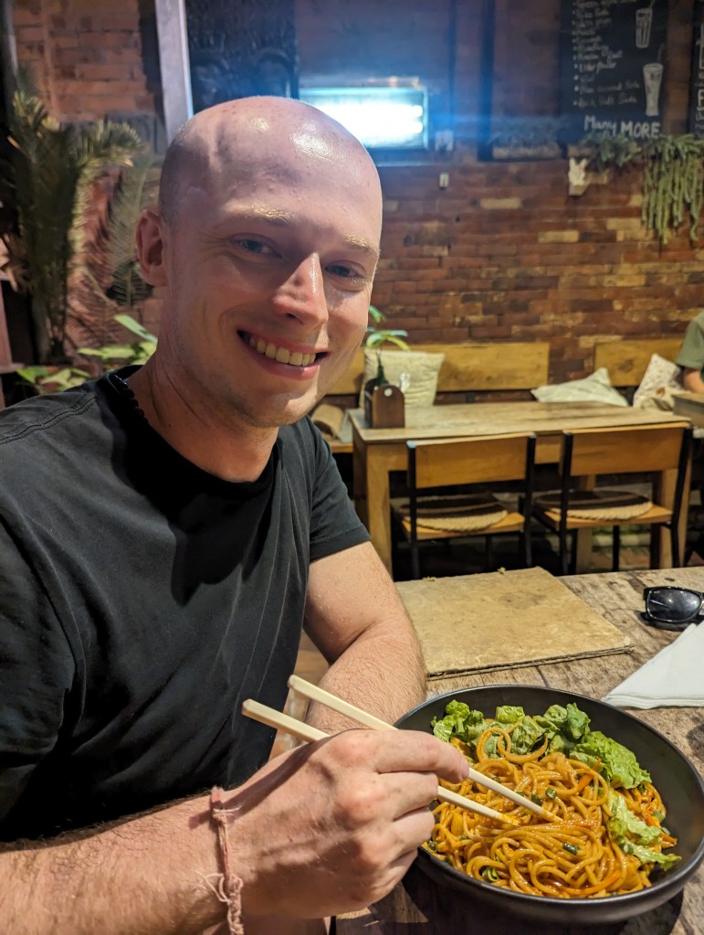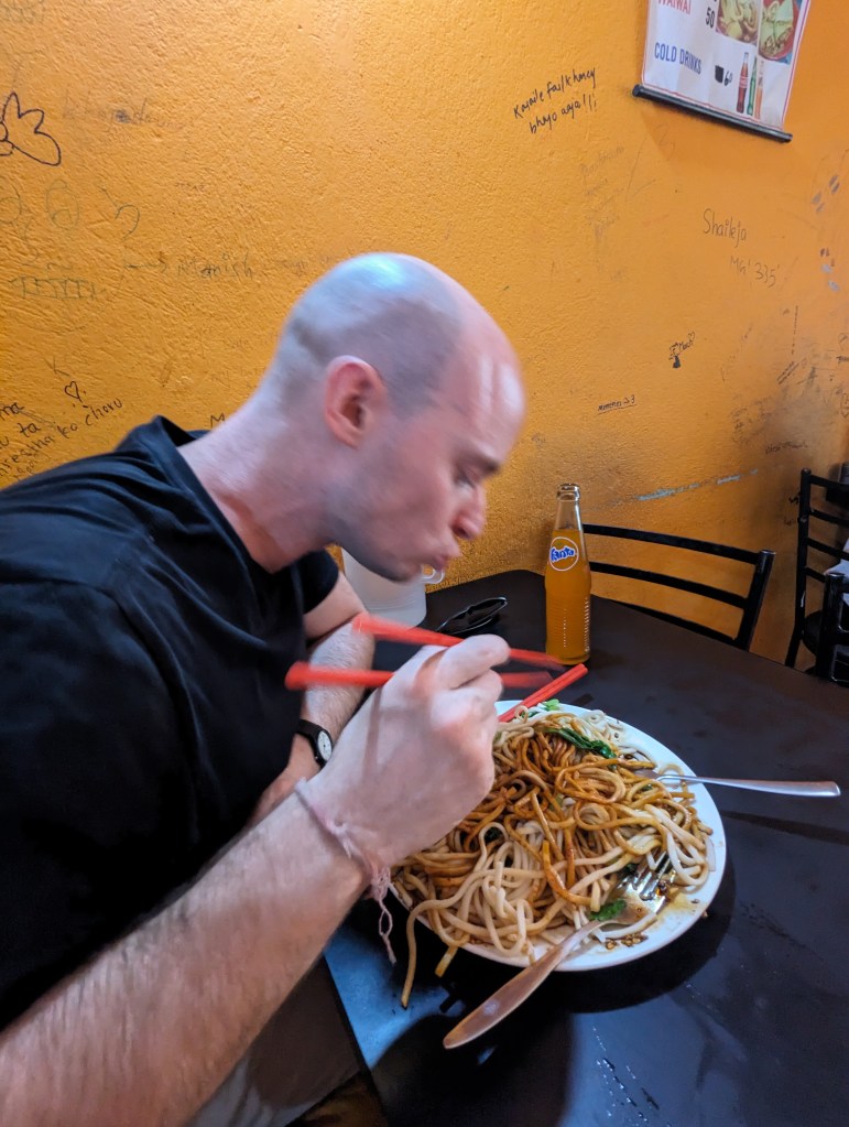 Food in Nepal has been largely more expensive than in India, especially in the tourist restaurants. As such, we resolved to find a local restaurant where the meals tended to be about a quarter of the price. We walked through the picturesque backstreets of Bhaktapur to a local noodle and momo bar, and ordered the veg noodles to share. The waiter came back to ask if we wanted it spicy, to which I said “normal spice” but he heard “no spice” and was gone before I could correct him. The noodles came out plain with just soy sauce and something like bok choi, but still made for quite a tasty lunch.