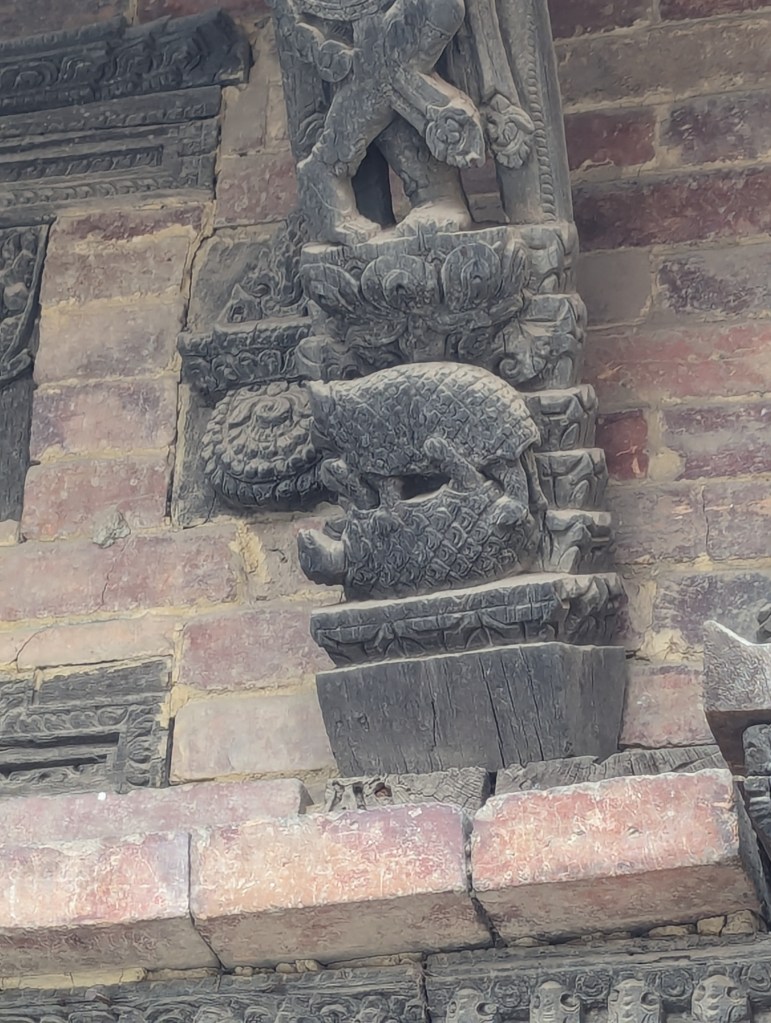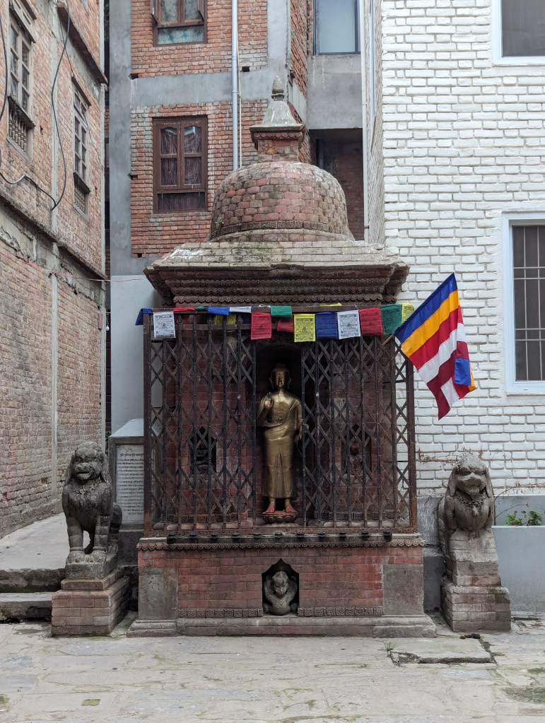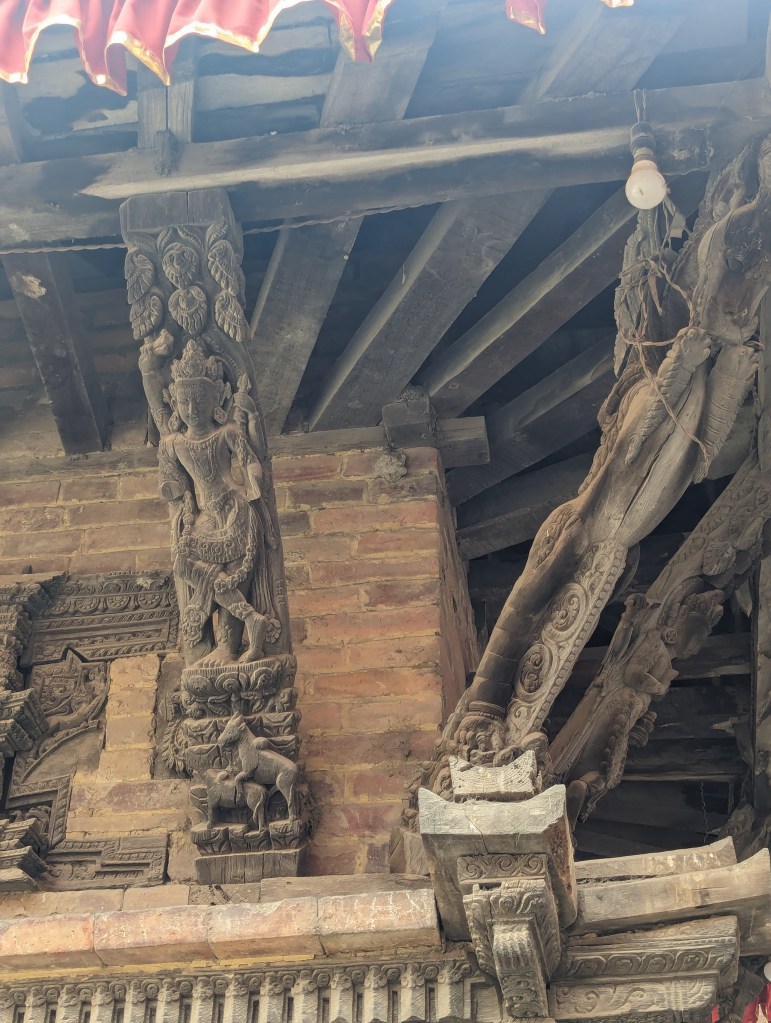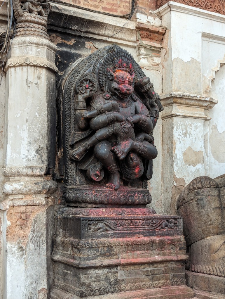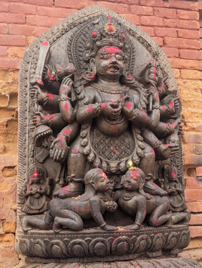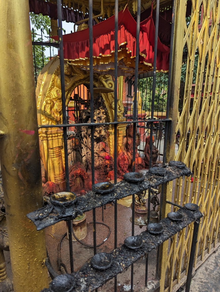 From the square, the walk took us for the best part of an hour through the backstreets of Bhaktapur. Much like areas of Patan and other places we’d see in Nepal, there was an interesting and sometimes confusing fusion of Hindu and Buddhist religion (like the elephant headed Ganesh being repeatedly referred to as a Buddhist god). After some time we turned a corner and came up a flight of stairs to another Kali temple, which had the same eerie air as the last. The temple was deserted apart from a couple of young women and their small children who seemed to look after the place, and had a strange collection of statues and idols strewn over the complex. To add to this, a goat was sitting in the corner with a heavy iron chain and ball around its neck. We weren’t certain of its purpose, but both agreed that being a goat in a Kali temple was probably a pretty bad spot to be in.