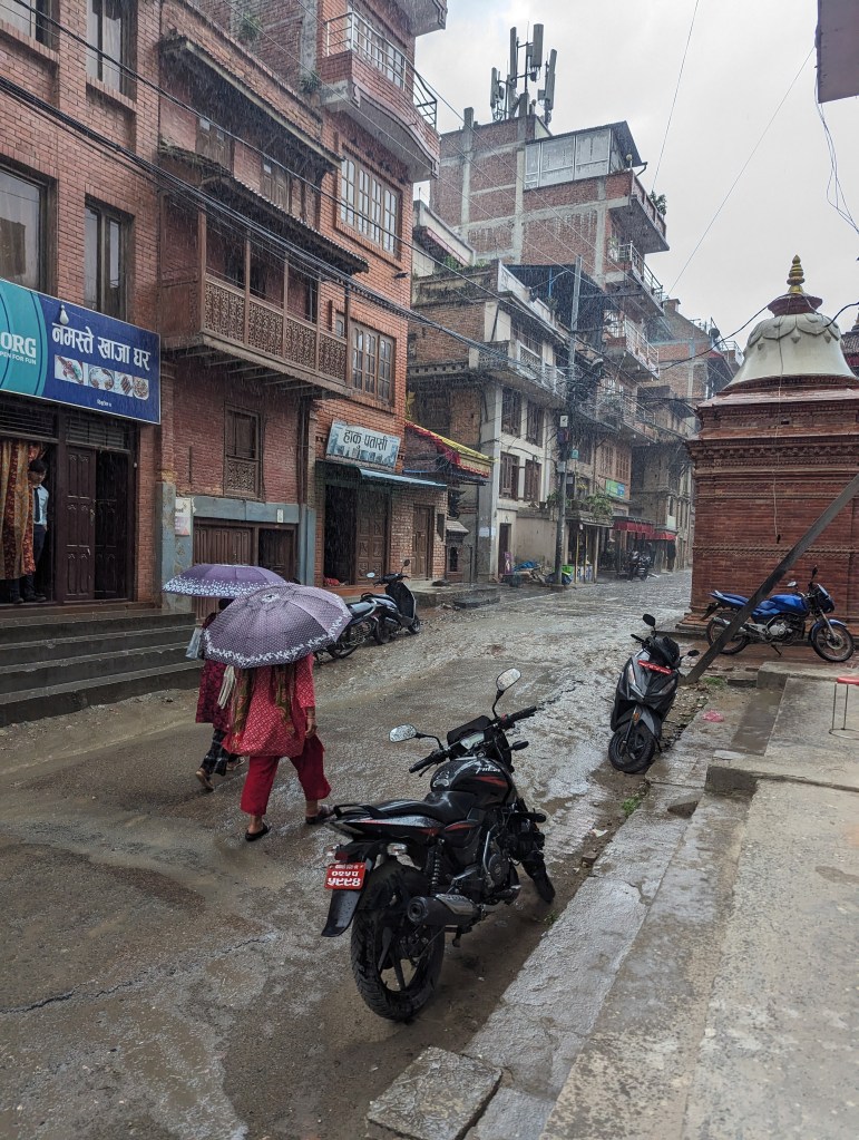 We didn’t make it – and rain started to fall in earnest whilst we were still ten minutes or so away. We hid under a small awning with a little black and white dog who enjoyed our company and watched the rain turn the street into a river. After twenty minutes or so, the rain started to abate and we made our still quite sodden way to the pottery shop. Thimi turned out to be no more picturesque than either Patan or Bhaktapur, but still made for a pleasant walk around, despite us getting a bit of a drenching.