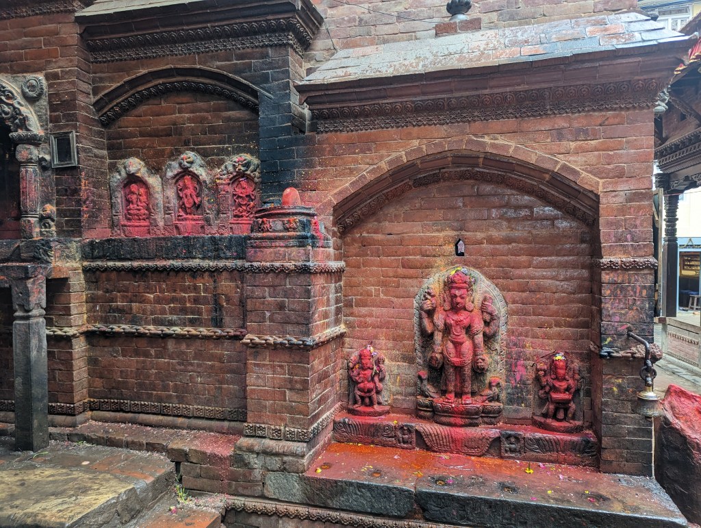 The walk started just outside Durbar Square, practically on our front door. The first thing to find was an old Shiva Parvati temple that had roof struts depicting lewd scenes apparently involving all manner of animals. It took a bit of searching, but we found it in the end, with the help of some of Nepali men who knew exactly what we were looking for. From there, we made our way down to a Kali temple which was made around the trunk of an old, gnarled tree, and had an eclectic group of locals hanging around it. Kali is a manifestation of the Goddess in Hinduism, and is usually depicted as vengeful, dripping blood from her tongue, and with a garland of skulls or severed heads. Kali temples, therefore, tend to have a bit of an atmosphere about them. This one was no exception, still having the blood of Saturday’s animal sacrifice splattered over the altar which was buzzing with flies.