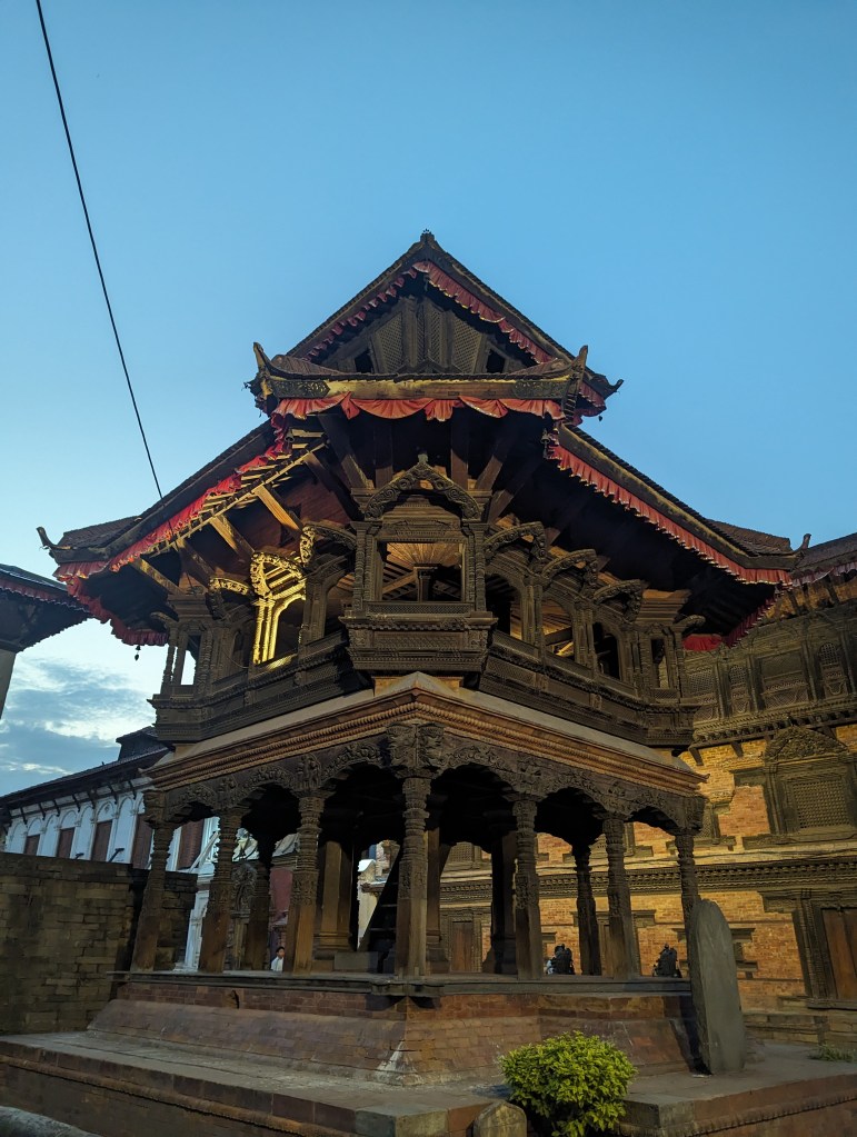 The walk eventually took us back round to Tachupal Tole, which was a smaller square in Bhaktapur and boasted two impressive temples. In front of one, a group of Krishna Consciousness devotees were doing a Hare Krishna chant and dance, which we watched for a while before wandering on further to complete our loop of Bhaktapur at the last of the three squares, Taumadhi Tole. Taumadhi Tole backed onto Durbar Square, and had two of Bhaktapur’s finest temples – one dedicated to the goddess Parvati and the other to Shiva. Here we stopped at a rooftop bar for a beer as the sun set over the beautiful square, then walked a little way down the road to a Thai restaurant.