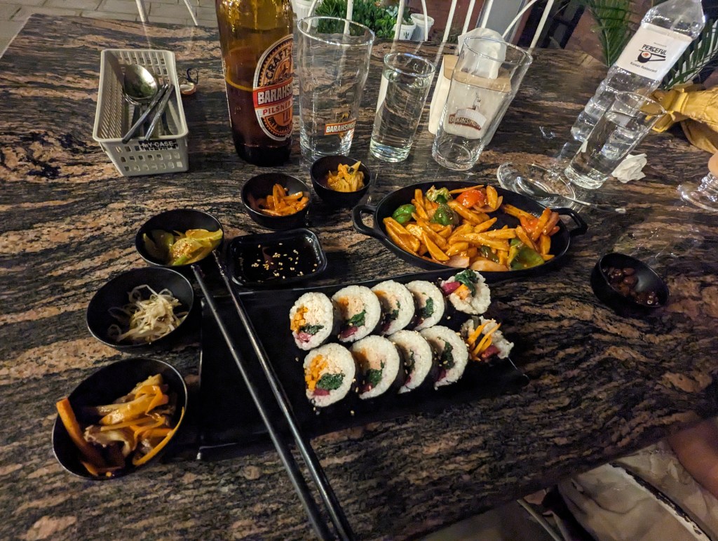 The Korean restaurant, ‘Peaceful Korean’ was in a completely tucked away courtyard through a building on the street. It was definitely the nicest ambiance we’ve been in for ages, with lots of trees and lights hanging from them. We happily ate tuna sushi with a whole array of extras, Korean omelettes and sweet chilli chips which we’ve both been ordering non-stop since.