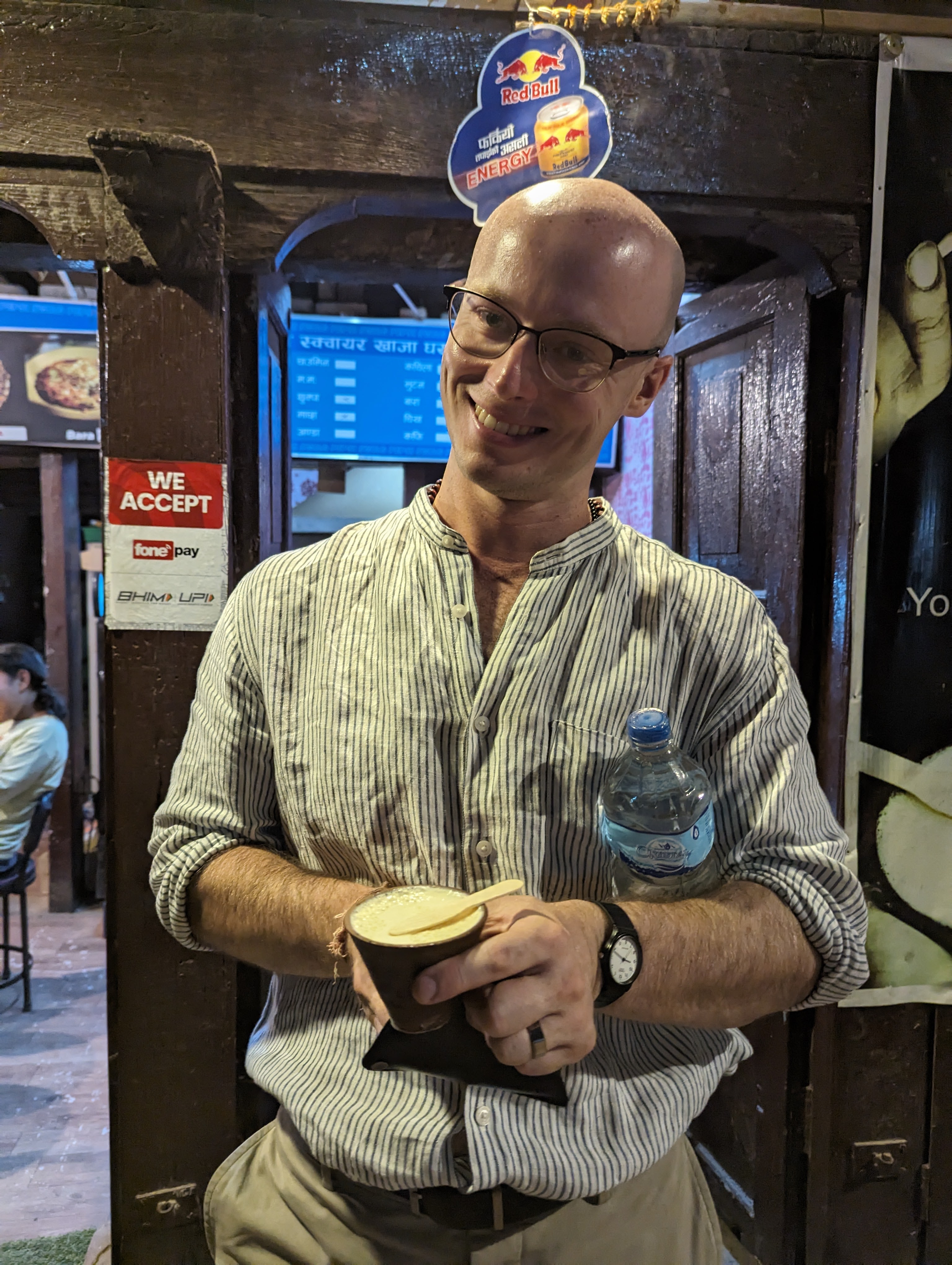 We walked home and found the door of our guesthouse locked as we’d missed the closing time of their restaurant, but happily took the time to grab another Juju Dhau (I think Rob’s 3rd of the day – Ed. note, not sure why I look so deranged in the below photo, but for all concerned I am still sane) and call the manager to let us in. We found 2 of the younger staff members in the restaurant having some drinks and looking sheepish as they let us in and up to our room, for the last night in Bhaktapur before heading up to the hills.
